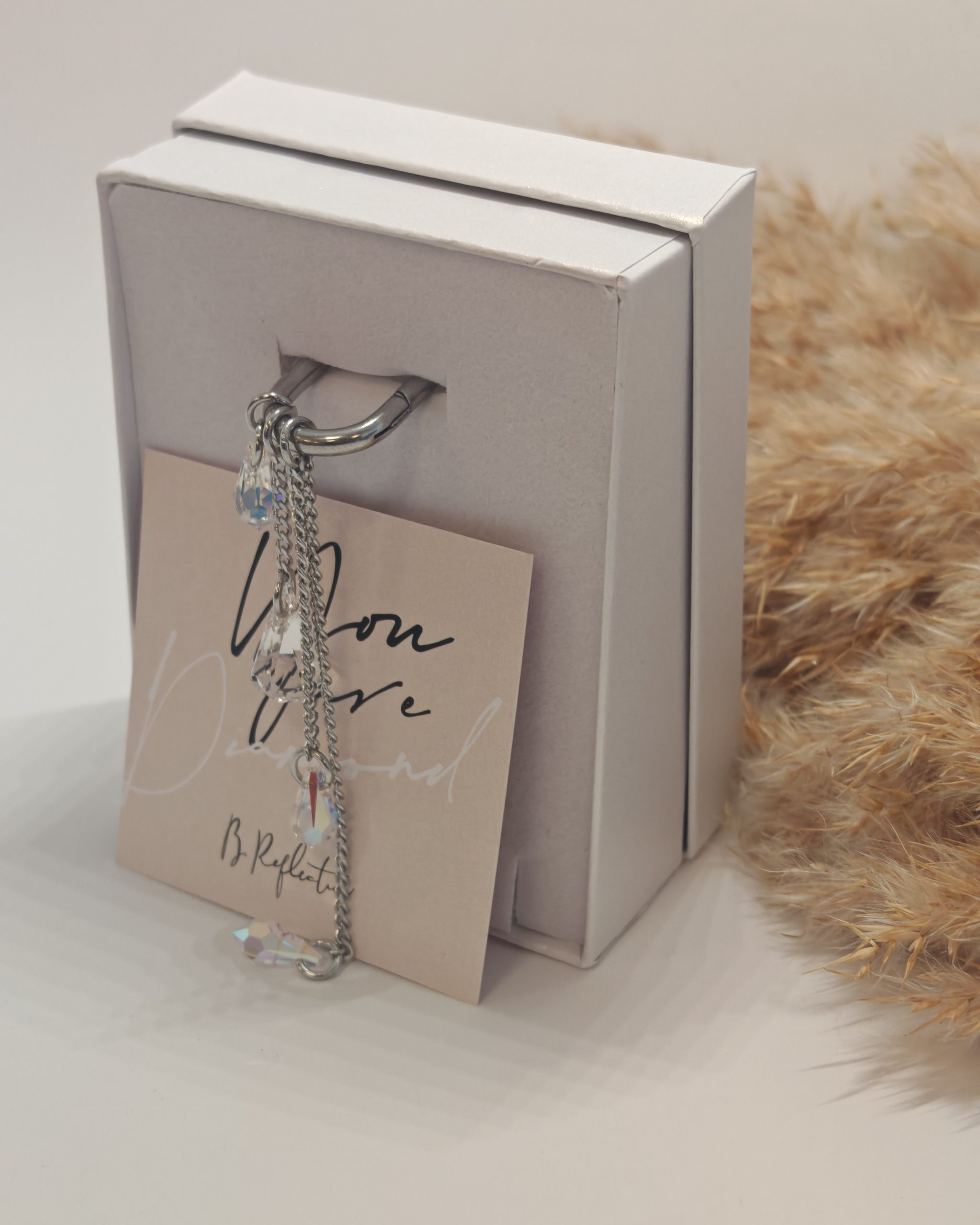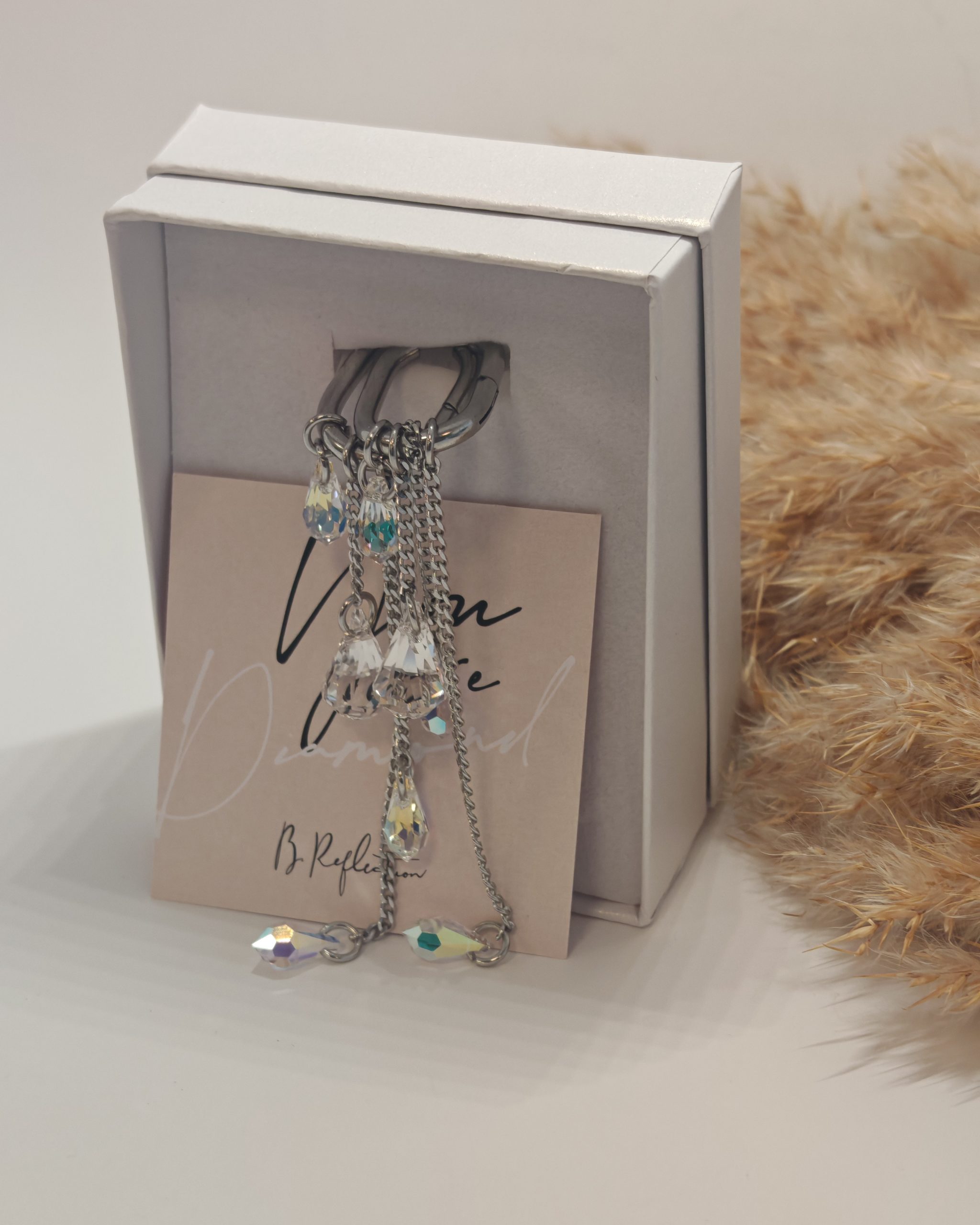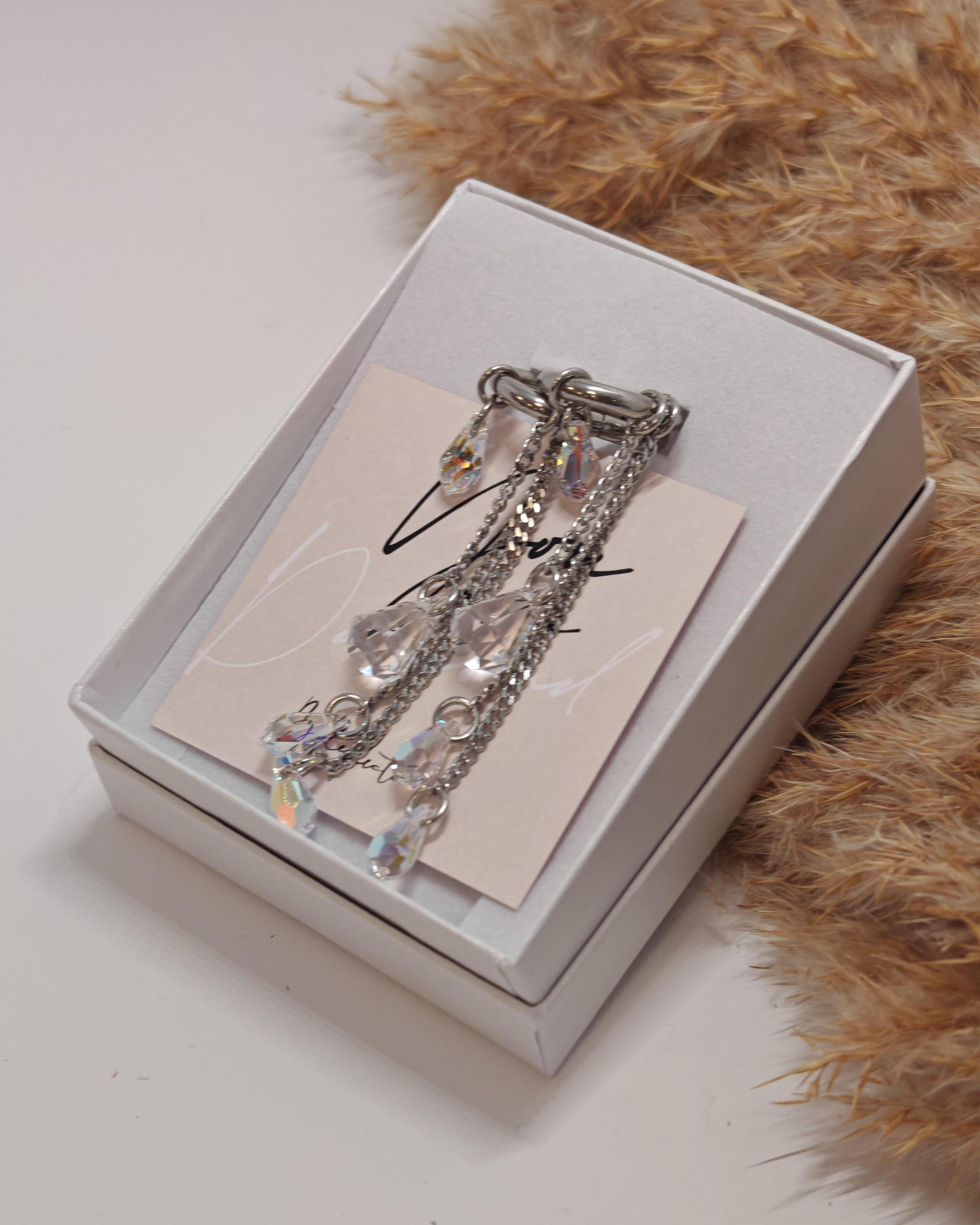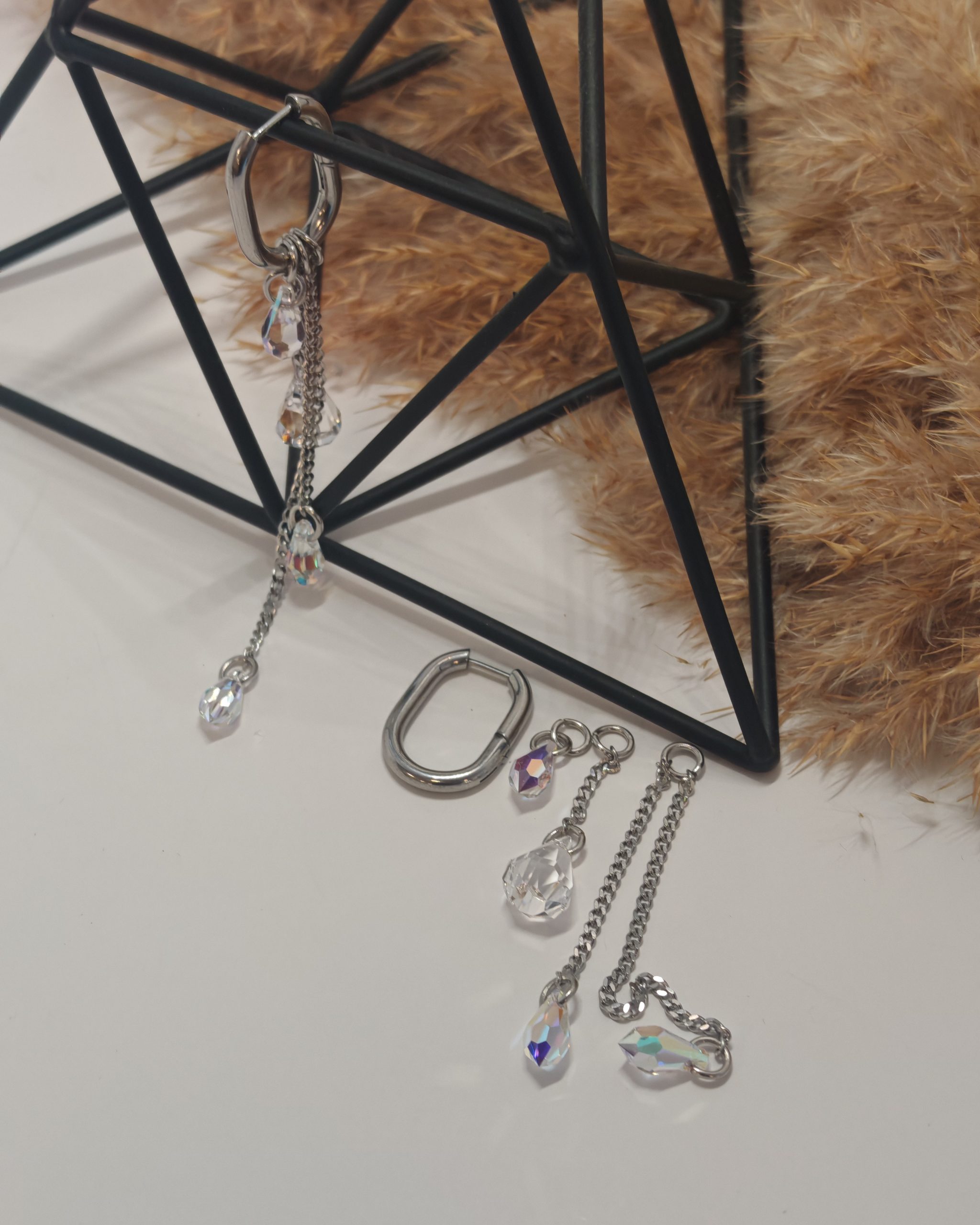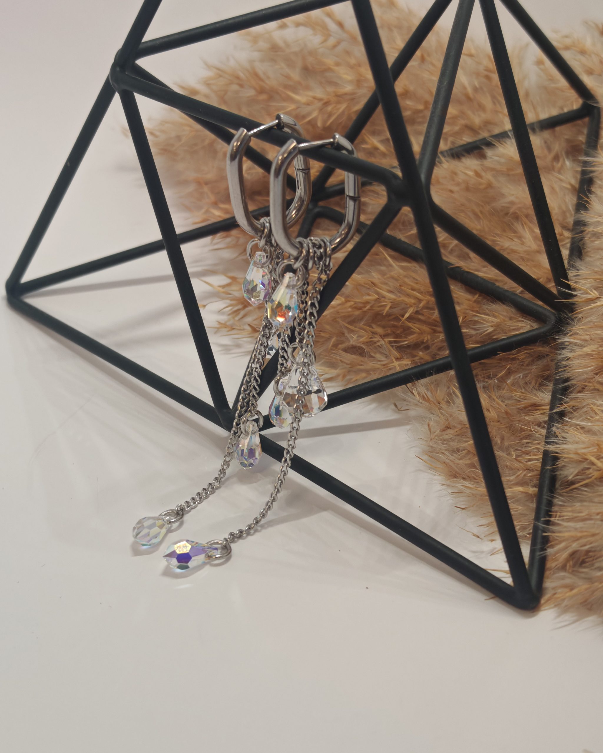 Uhani vključujejo Swarovski kristal v obliki diamanta ter tri kristale v obliki kapljice, ki skupaj ustvarjajo nežno, svetlečo kompozicijo. Njihova posebnost je večnamenska zasnova, ki omogoča, da uhane nosite na različne načine – glede na razpoloženje, priložnost ali stil.