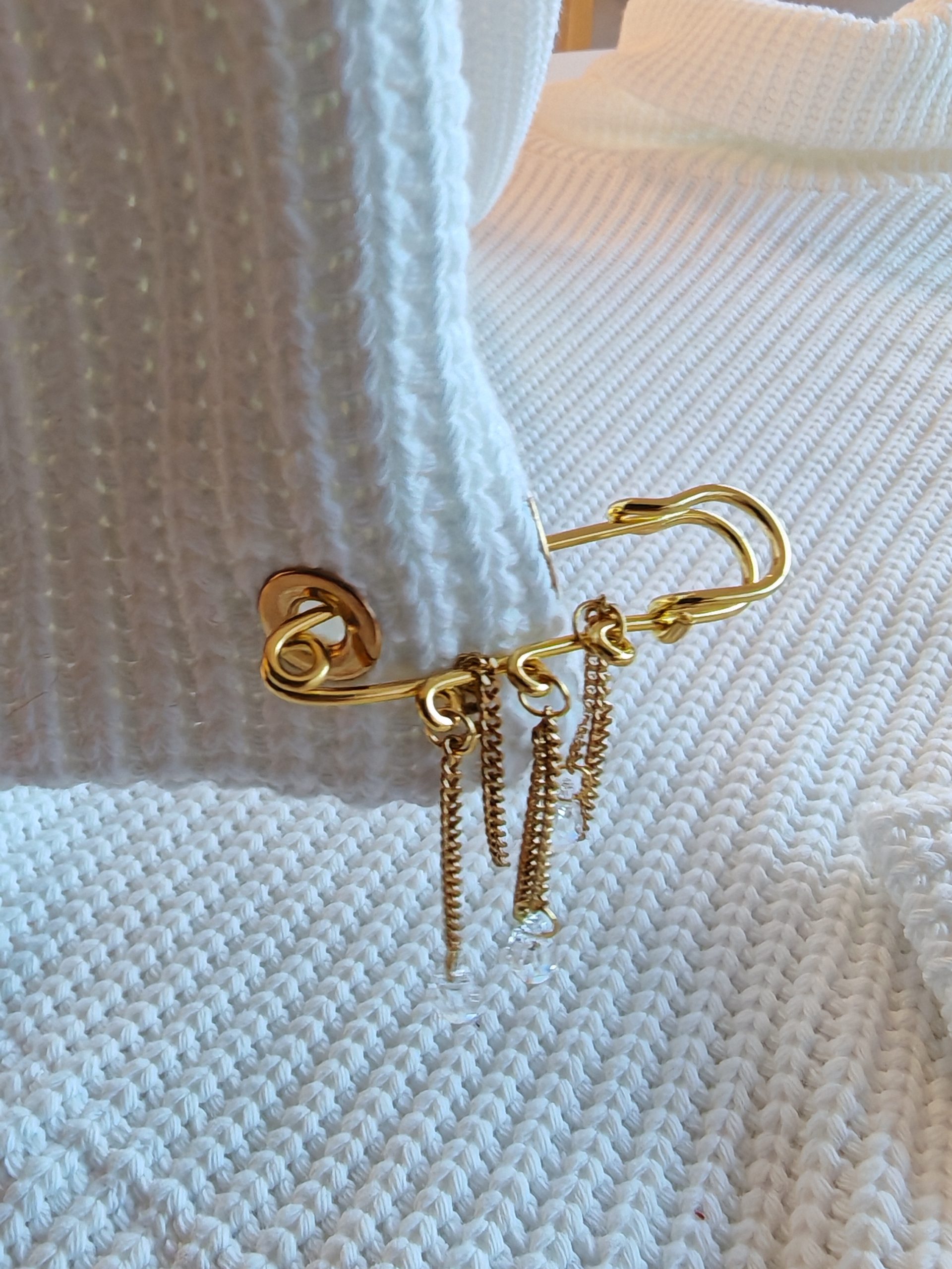 Na rokavu pulover krasi snemljiva broška, ki doda značaj in osebno noto. Lahko jo odstraniš in kombiniraš tudi z drugimi outfiti – na plašču, srajci ali torbici – ter tako vedno znova ustvariš nov detajl zgodbe.