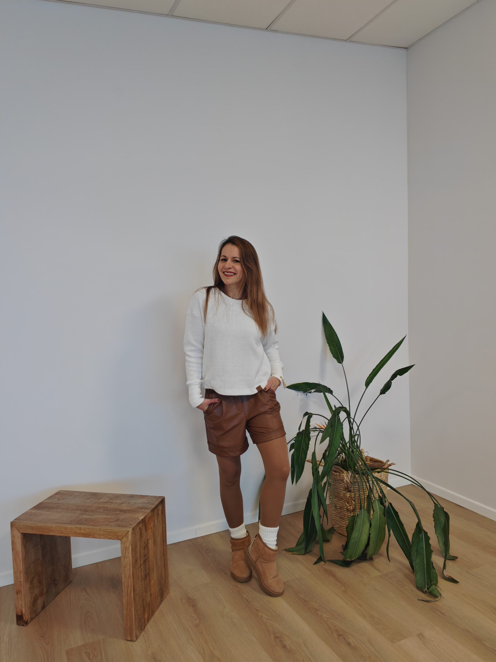 Posebnost puloverja se skriva v premišljenem detajlu na pasnem delu – na notranji levi in desni strani je všita elastika, ki omogoča dva načina nošenja. Lahko ga nosiš sproščeno, v naravni oversize obliki, ali pa ga nežno stisneš in ustvariš bolj poudarjeno, ženstveno linijo. Tako en kos ponuja dva različna izraza – od udobnega do subtilno oblikovanega.